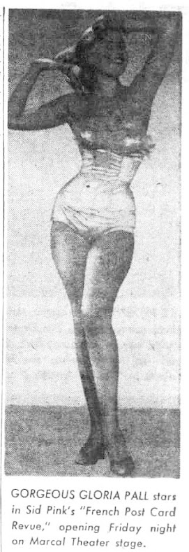 Star of the revue, the "Gorgeous" Gloria Pall, gets a bit of promotion in the Mirror in 1953. Thanks to Ken for locating this. J.H. Graham notes that the next show up was "Brooklyn U.S.A.," a show about the mob that, like "French Postcard," also got bad reviews.