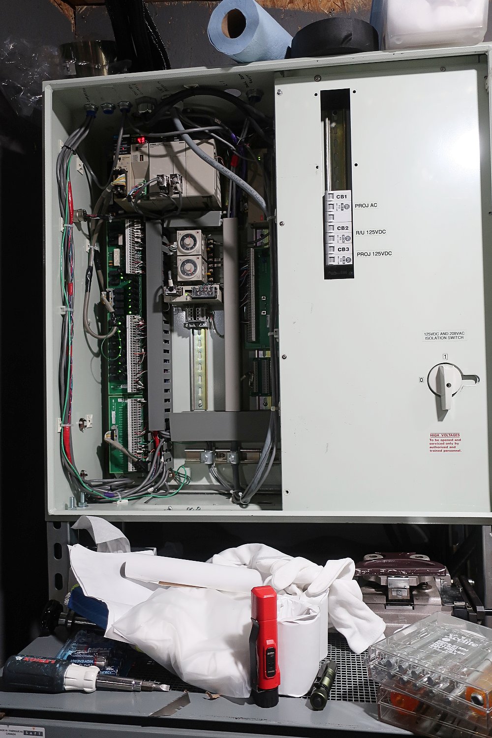 Back in the right corner it's the DC power supply for the projector motor and the platter system. To the right is the booth's temporary electical service and, farther to the right out of the frame is the rectifier for the projector's 7Kw xenon lamp. Photo: Bill Counter - July 2023