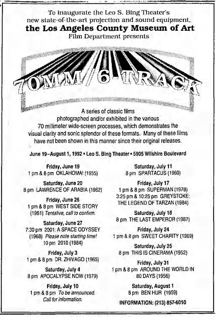 70mm capability was added in 1992 with installation a new screen, new sound system and Century JJ2 projectors. They celebrated with a festival of 16 films to show off the new capabilities. Thanks to Michael Coate for sharing this June 18 ad from the L.A. Times. He notes that the July 10 "to be announced" screening turned out to be "Gandhi."