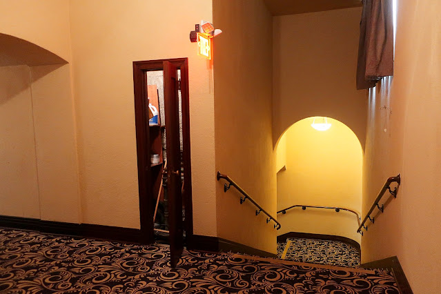 Also of interest at the top landing is this corridor running behind the back wall of the stagehouse. Off to the right it's offices and restrooms. The stairs in the foreground, as well as another set this side of the firedoor at the end, lead to a similar corridor a floor above as well as access to the 3rd floor Solarium, Terrace and Fine Arts Theatre. The firedoor gets you into the backstage stairwell and