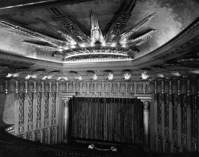 A closer view of the ceiling above the proscenium. Much of the sunburst was missing as a result of decorative plaster pieces being removed when the building was stripped. For the 1984-85 restoration the big hole was filled in by relocating some plaster elements and creating a new section (simpler than the original) at the front of the design. Photo: Hunter Kerhart - 2014
