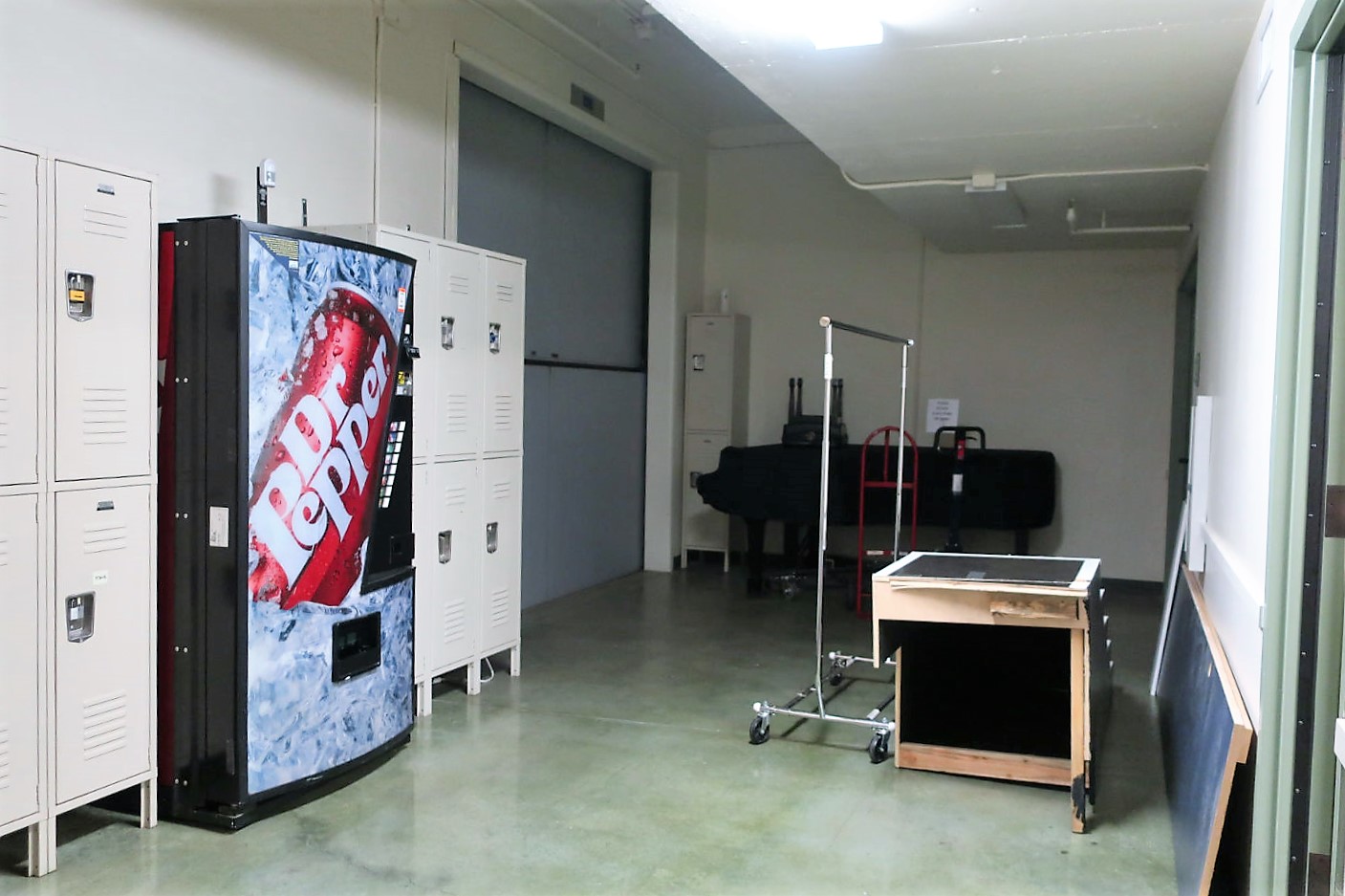 Head straight off left and you hit a door leading to this room on the offstage side of the freight elevator. We're looking upstage with the elevator out of the frame to the left. On the right are ramps down to an equipment storage area. Photo: Bill Counter - 2019