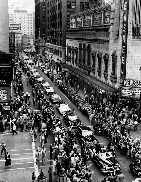 1952 - A parade view looking east on 8th. It's a Herald Examiner photo in the Los Angeles Public Library collection. The Library also has another similar view. The parade was for Adlai Stevenson. Note the Newsreel signage in the frames atop the 8th St. facade.