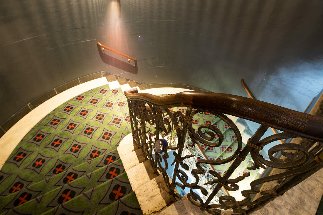 The house right stairs from the balcony looking down to mezzanine level. Photo: Hunter Kerhart - 2014