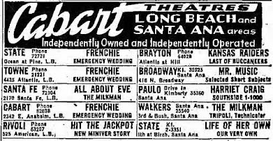 A December 31, 1950 ad in the L.A. Times for the State and other theatres in the Cabart circuit. Thanks to Ken McIntyre for locating it.